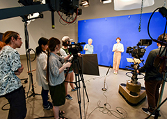 番組づくりが行われる最新の機材が整う学内テレビスタジオ。ビデオロケや編集作業の演習も