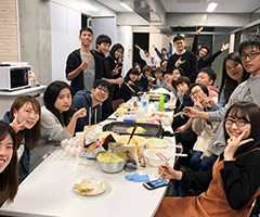 国際交流施設・学生寮「りゅうとぴあ」でお好み焼きパーティーを楽しむ学生たち。現在12カ国の学生が共同生活を送り交流している