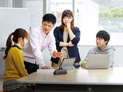 「ベーシックキャリアデザイン」では、100人を超える大規模授業ながら、グループワークを通じて自己理解・他者理解を深め、社会で求められるコミュニケーション能力や創造性を高めていく。また社会人ゲスト講師による講演を通じて、卒業後も見据えたキャリア意識の醸成を目指す。ミディアムサイズの総合大学だからこそ可能な共通教育は、学生一人一人の個性と人間力を磨き、それぞれが成長を実感できる機会となっている。