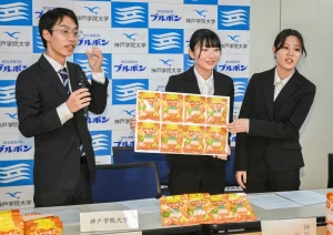 「産学官連携」分野では企業とコラボした商品企画を展開。その一つとして、経営学部の辻幸恵教授ゼミ生と大手菓子メーカーのブルボン、兵庫県が連携し、新商品「しゃりもにグミ想いをつなぐシトラスミックス味」を開発した。大学と県は「地域創生に係る包括連携協定」を締結している。